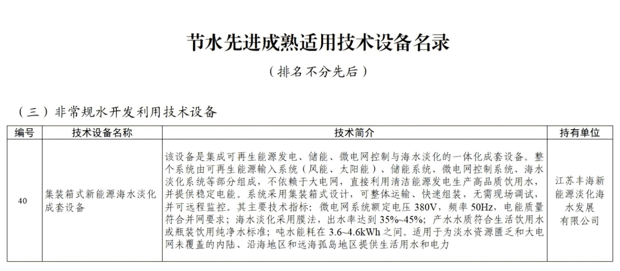 中华人民共和国水利部对《节水先进成熟适用技术设备名录(2025年)》进行了公示,丰海公司的集装箱式新能源海水淡化成套设备成功入选。