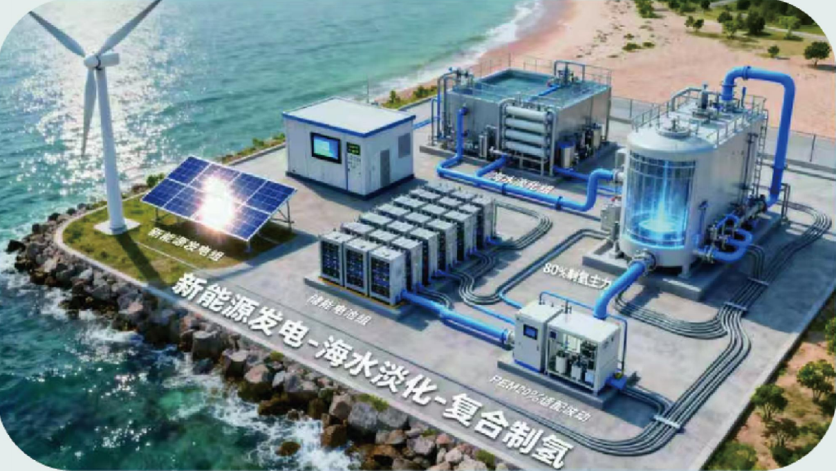 以新能源智能微电网(风机、光伏等)为核心电力源,先通过海水淡化去除盐分与杂质,获取符合电解标准的淡水;制氢环节通过“AM(碱性电解槽)+PEM(质子交换膜电解槽)”有机组合,适当调整比例,将AM作为制氢主力,PEM抵消风机风速骤变、光伏光照波动带来的电力不稳定影响,最终实现“绿电波动适配+高效稳定制氢”的双重目标。